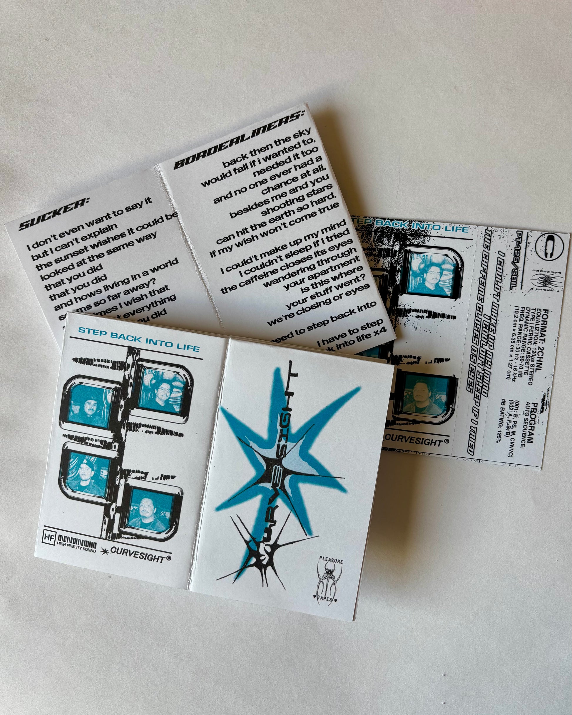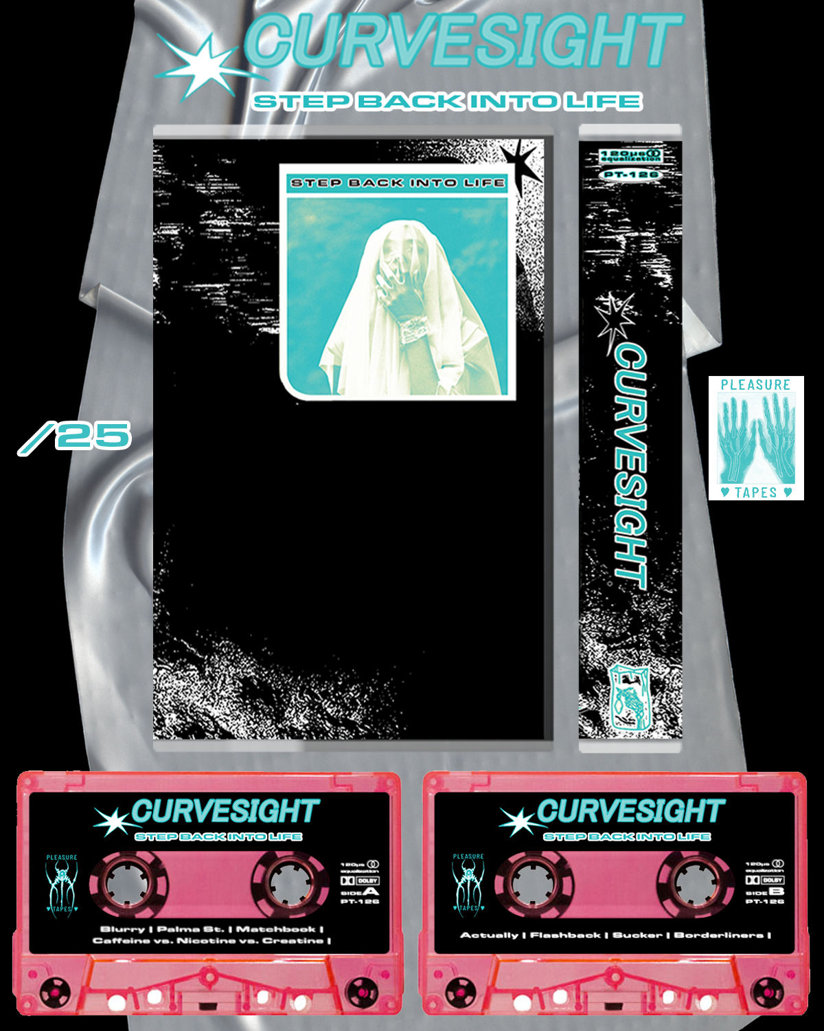 Limited edition of 25 real time duplicated, homedubbed, hand assembled translucent pink cassettes with full print A/B labels + a bonus 8-fold zine with lyrics & the hand drawn Curvesight logo