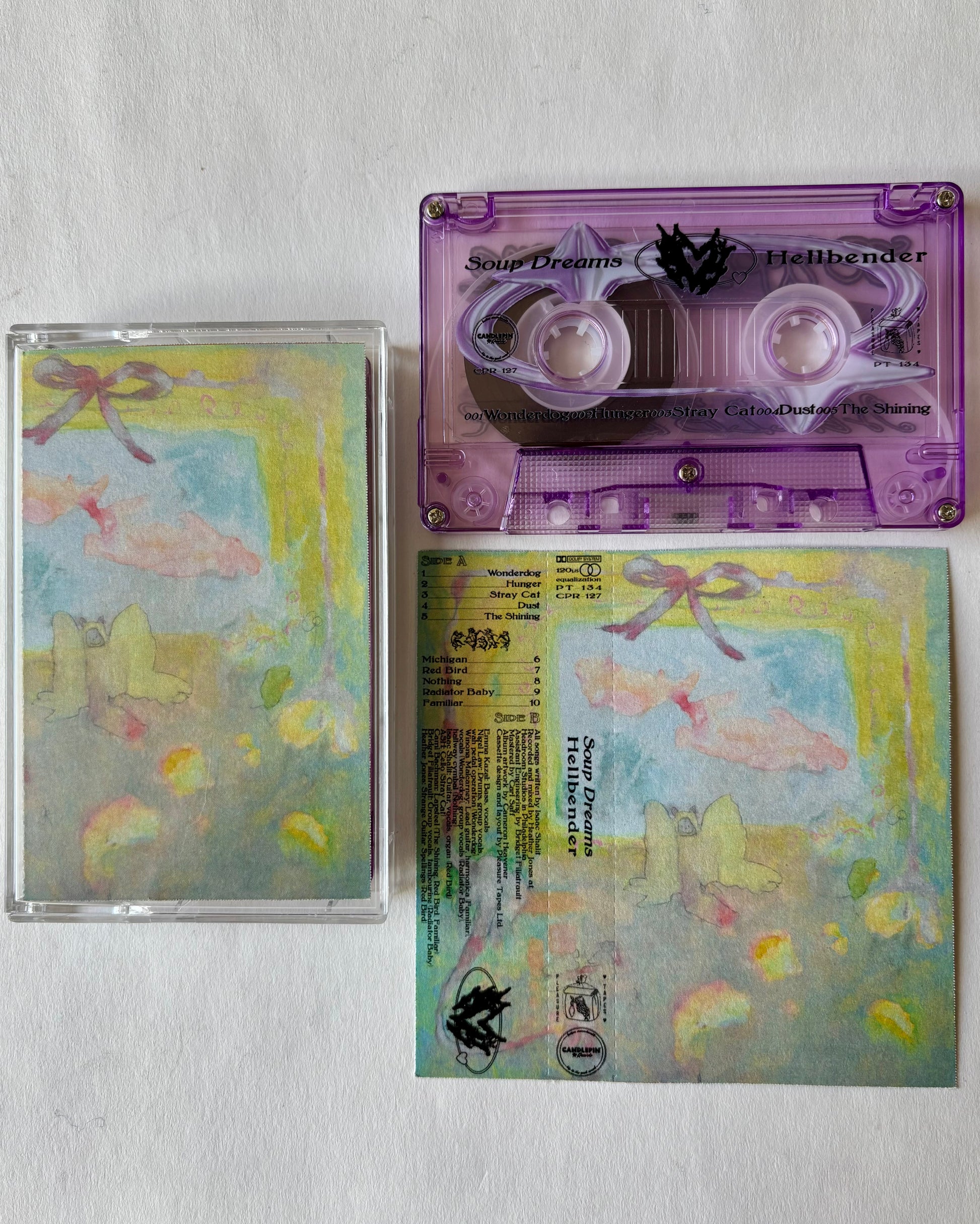 Limited edition of 50 real time duplicated, homedubbed, hand assembled translucent purple cassettes with transparent vinyl sticker labels